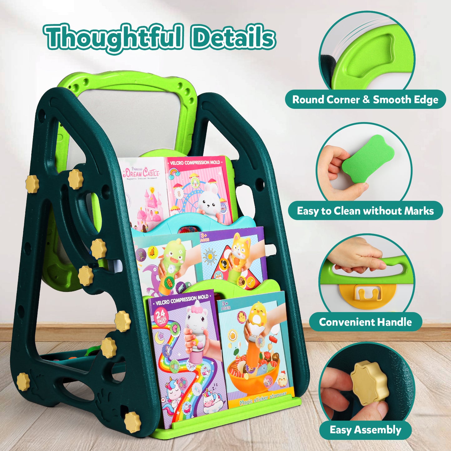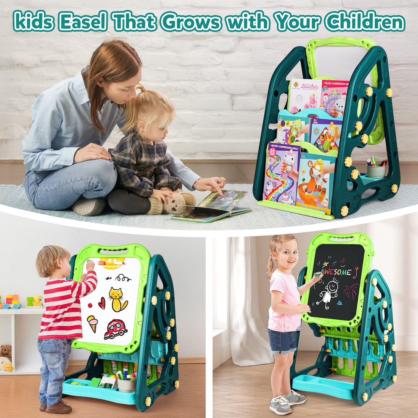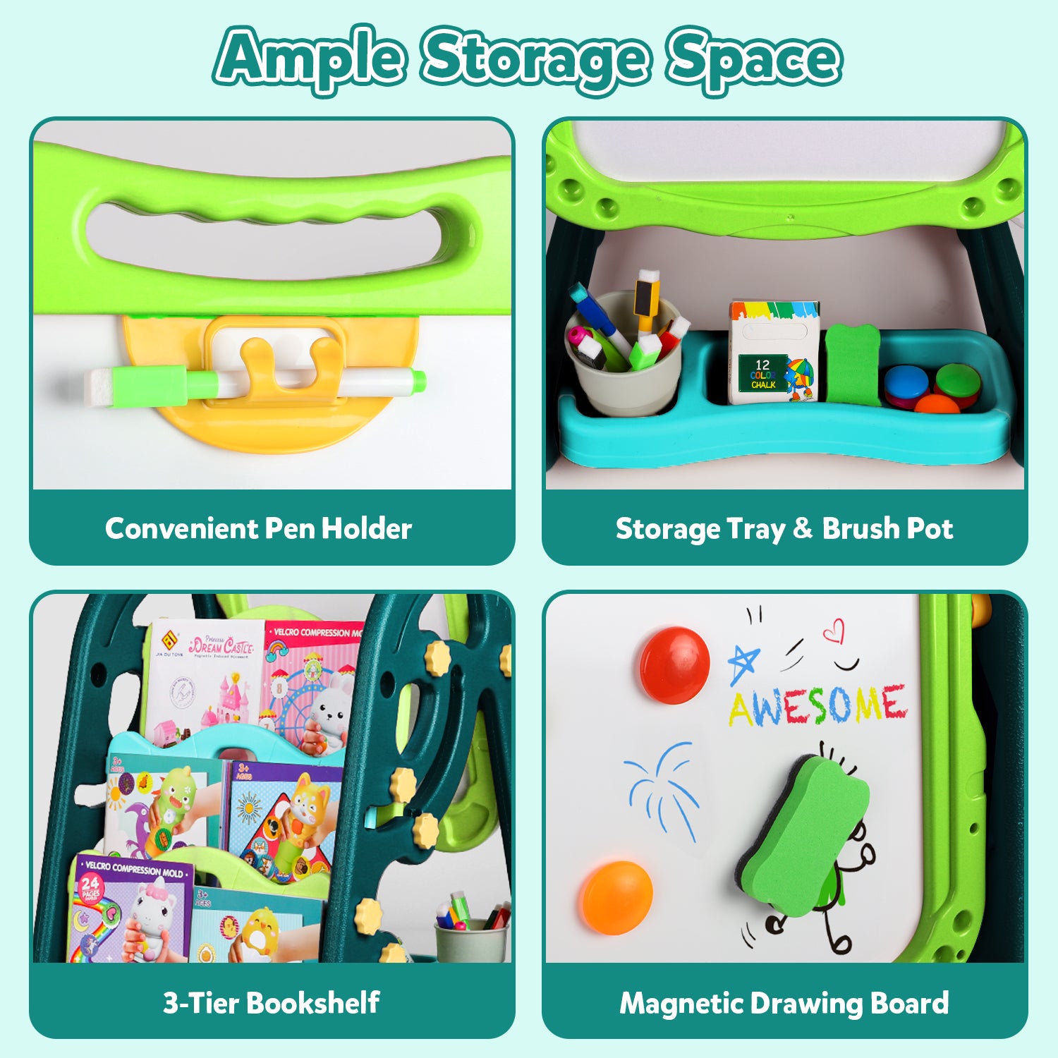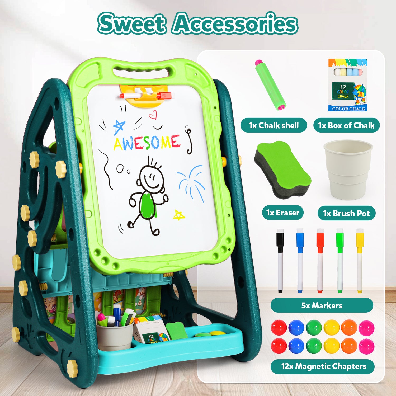 This easel comes with a complete set of accessories including colorful markers, chalk, eraser, and a convenient storage tray to keep everything neatly organized. The built-in shelves also allow children to store books, colors, and art supplies, making it a multifunctional play and learning station.