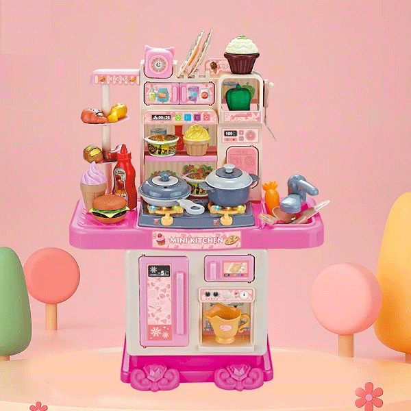 As children turn the knobs or press buttons, realistic sounds like boiling and frying are activated, adding to the sensory experience. The sink features a water circulation system, allowing kids to “wash” dishes and play hygienically. With its colorful design and easy-to-handle components, this kitchen set enhances hand-eye coordination, motor skills, and early learning through pretend scenarios.