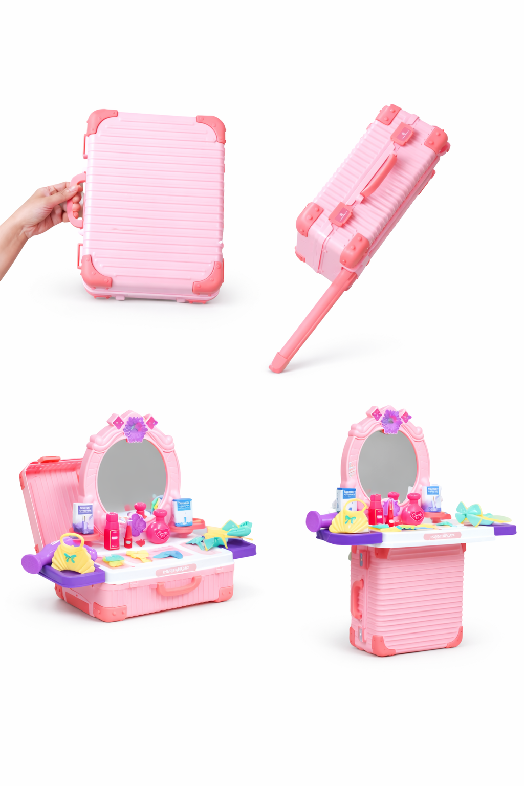 Crafted from durable and non-toxic materials, the vanity set features smooth edges to ensure safe play. The compact suitcase design with wheels and a sturdy handle makes it portable and easy to store. Children can carry it like a trolley bag and set it up anywhere for instant fun.