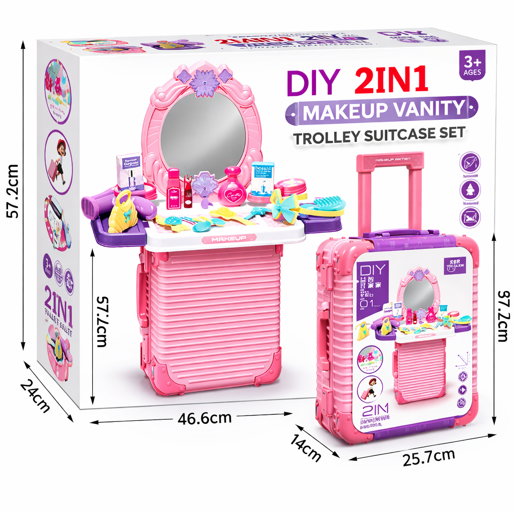 The 2-in-1 DIY Kids Makeup Vanity Trolley Suitcase Set is a multifunctional beauty playset that combines fun, creativity, and convenience. Designed especially for young girls, this stylish suitcase quickly transforms into a fully equipped vanity table with a mirror, allowing children to enjoy realistic pretend makeup sessions.