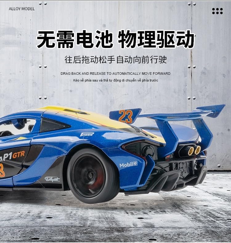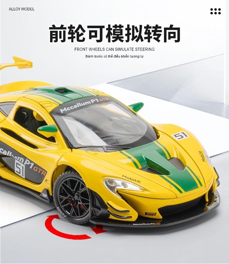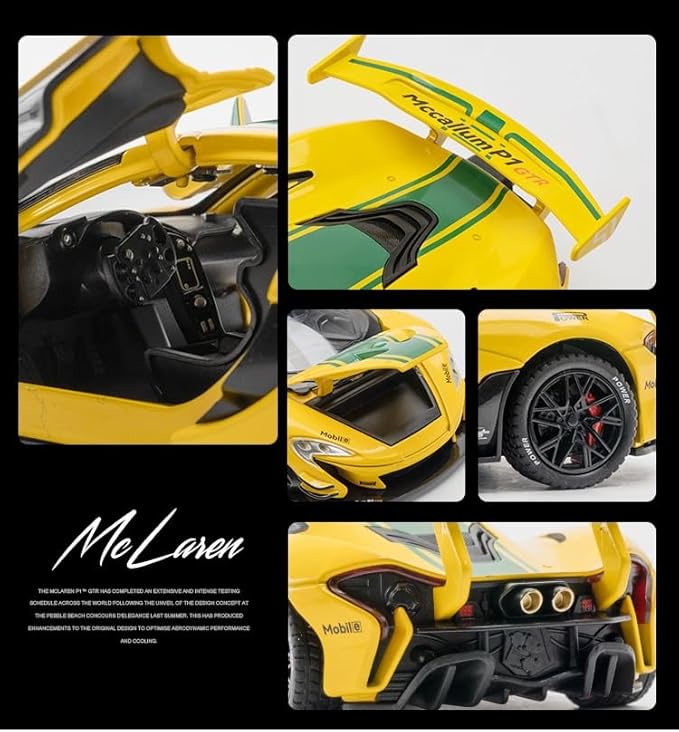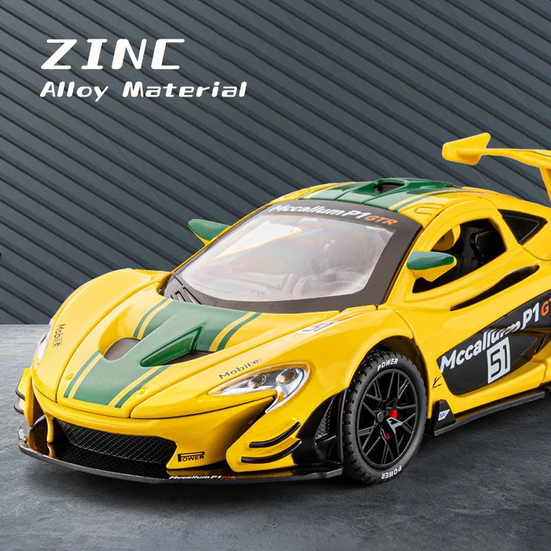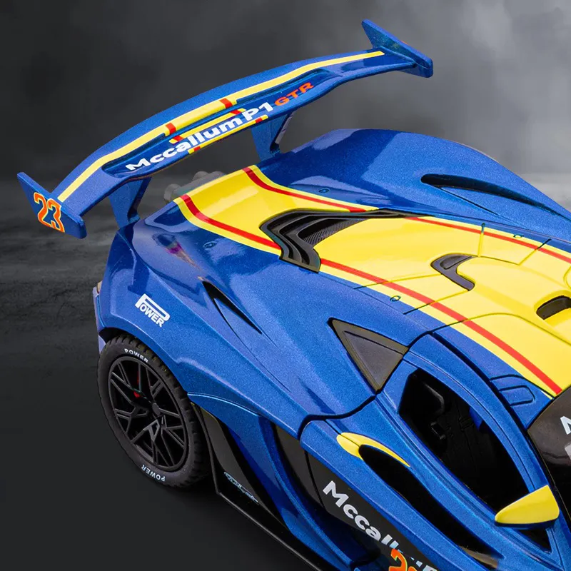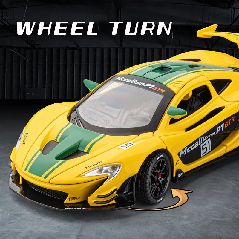 The McLaren P1 GTR die-cast model brings the thrill of the supercar world into miniature form. Built with a solid metal (die-cast) body and detailed plastic components, this model carefully captures the aerodynamic lines and aggressive styling of the real P1 GTR. The toy features opening elements—doors, hood, and trunk—so enthusiasts can inspect the interior, engine bay, and trunk area.