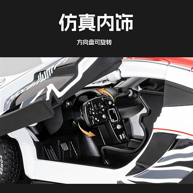 It is equipped with sound effects and LED lights (headlights and taillights) for enhanced realism. Its pull-back mechanism (if included) lets kids push the car backward and release to watch it zoom forward across flat surfaces. The wheels turn to simulate steering action, making it more engaging during play. The rich paint job and precision detailing—badges, vents, graphics—add to its collectible appeal.